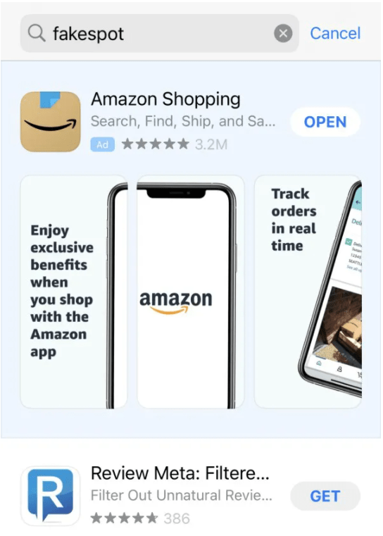 Fakespot是一個專門識別清除虛假產品評論的應用程式,通過分析亞馬遜列表評論的可信度來工作,並給予從A到F的等級。然後為消費者提供滿意度高的產品推薦。但近日,在收到亞馬遜的投訴,稱 Fakespot無法准確檢測其商店中的不良賣家和虛假報導後,蘋果於從其App Store下架了Fakespot應用程式。