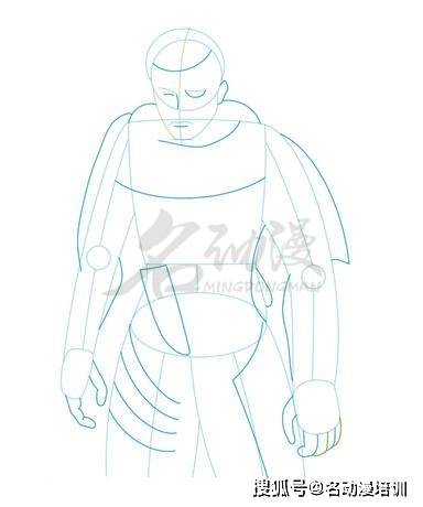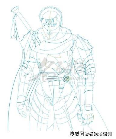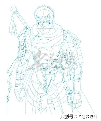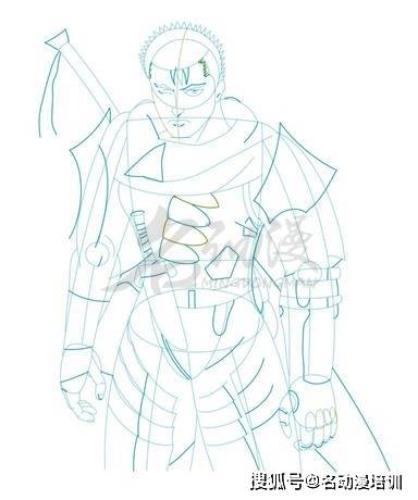 第一步:首先構思好格斯的動態以及整體的造型,再畫出鎧甲的雛形,然後畫出頭部和概括頭發的面積,最後勾勒出五官的造型。這樣,格斯的雛形就畫出來了。