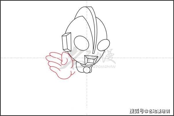 第三步:在奧特曼頭部底部畫出身體的一部分後,在頭部與配飾的交接處,畫出延長線形成手臂,然後奧特曼的手掌畫出來,記得畫一個帥氣的手勢。