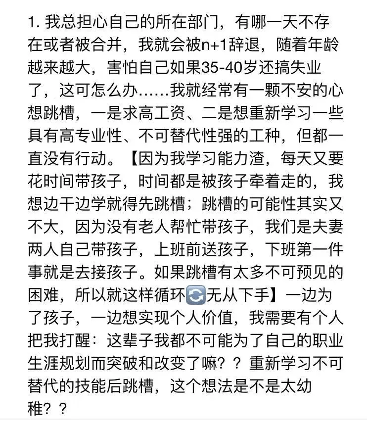 她們的心情是可以理解的,跟《30歲再「學個技術」,還有用不?》所述的一樣。你看另一位寶媽群友的擔憂之一。