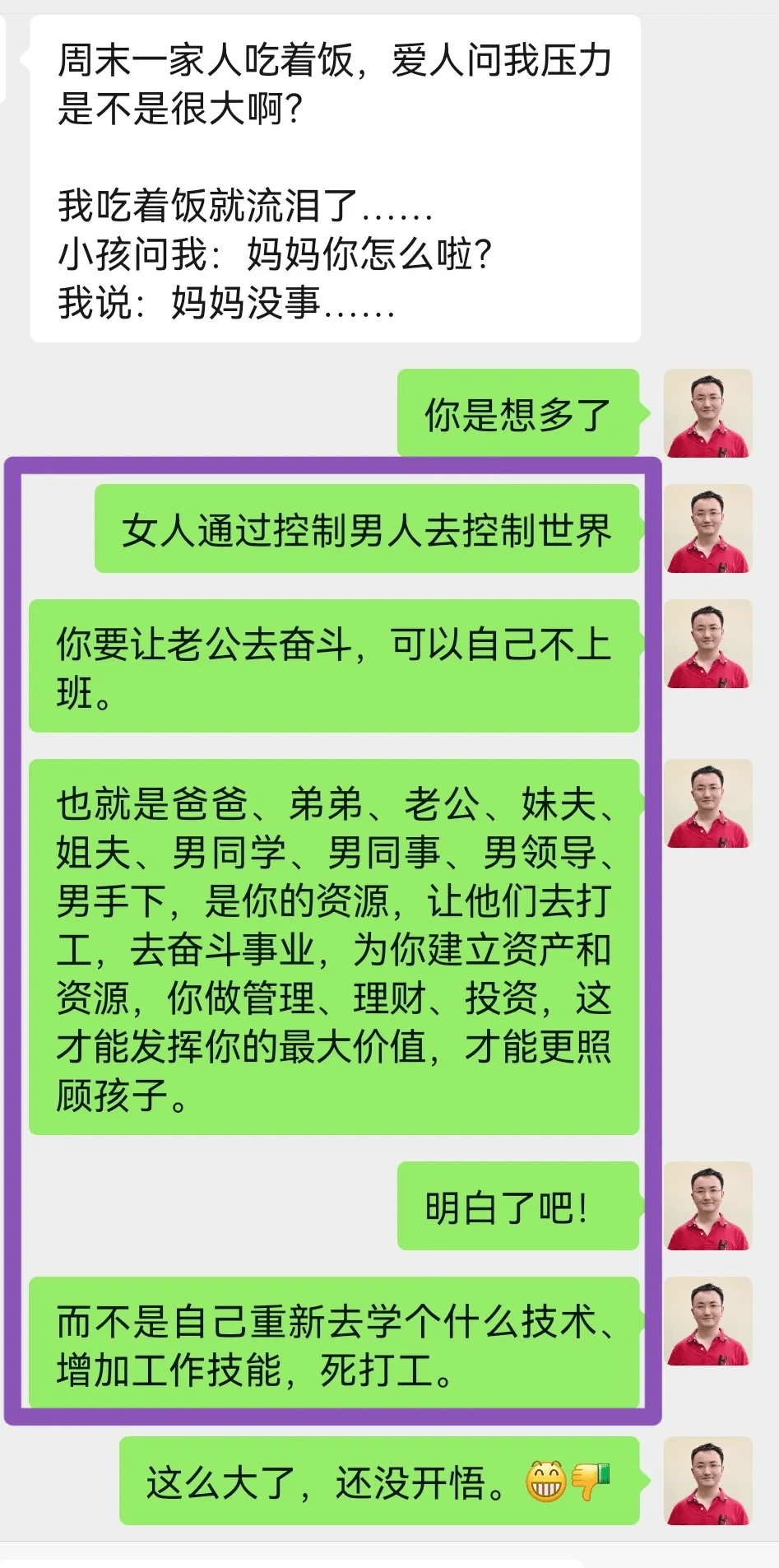 但你更要側重的是善於去管理身邊的男人,尤其你自己的男人。我老婆只有我十分之一的收入,我看她這方面就做得很好。我當然不是凡爾賽,或者比較賤,而是實事求是敘述,也是總結歷史的建議。