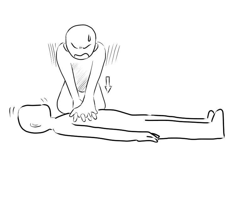 按壓位置為胸骨中段1/3與下段1/3的交界處,左右手交疊並垂直下壓,保持平穩有規則,不可以間斷,也不可過度用力,一般成人每分鍾按壓100~120次。