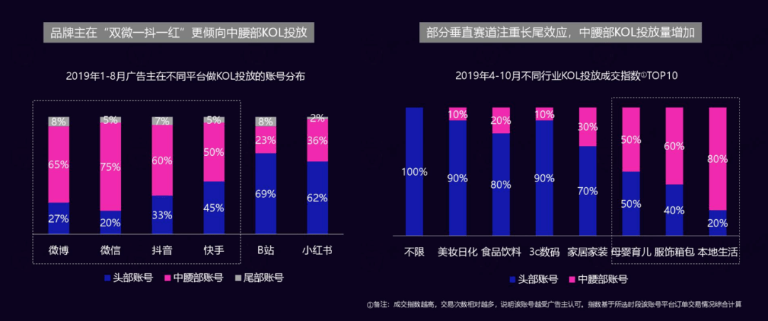 其中提到,廣告主投放KOL正在快速「下沉」。尤其是「雙微一抖一紅」平台,平均60%的投放是投給了中腰部帳號。