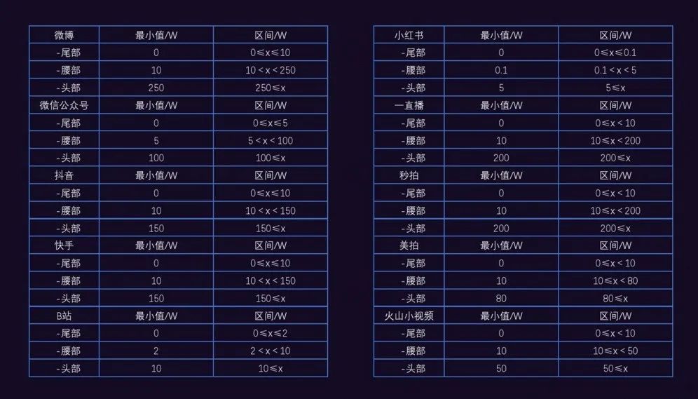 這份報告更細致,針對不同平台給出了不同的標准。比如,在微博,250萬以上粉絲才叫頭部帳號,10萬以上粉絲只是中腰部帳號;而在小紅書,5萬粉絲就是頭部帳號,1000粉絲就算中腰部帳號,可以接單變現了。這和業內實操也是吻合的,可見報告的專業性和嚴謹分析的態度。
