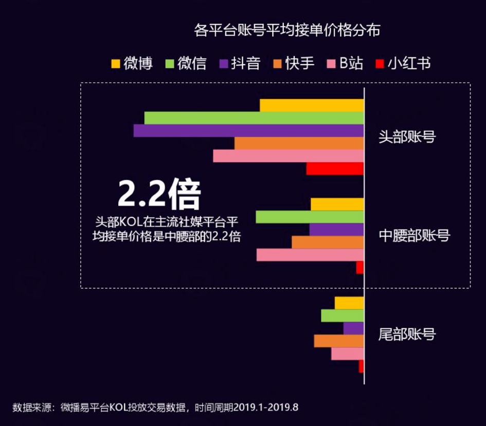 按照報告中,頭部帳號平均接單價格是中腰部的2.2倍的數據計算,這意味著,廣告主在頭部KOL和中腰部KOL身上花費的預算幾乎是一半一半了。