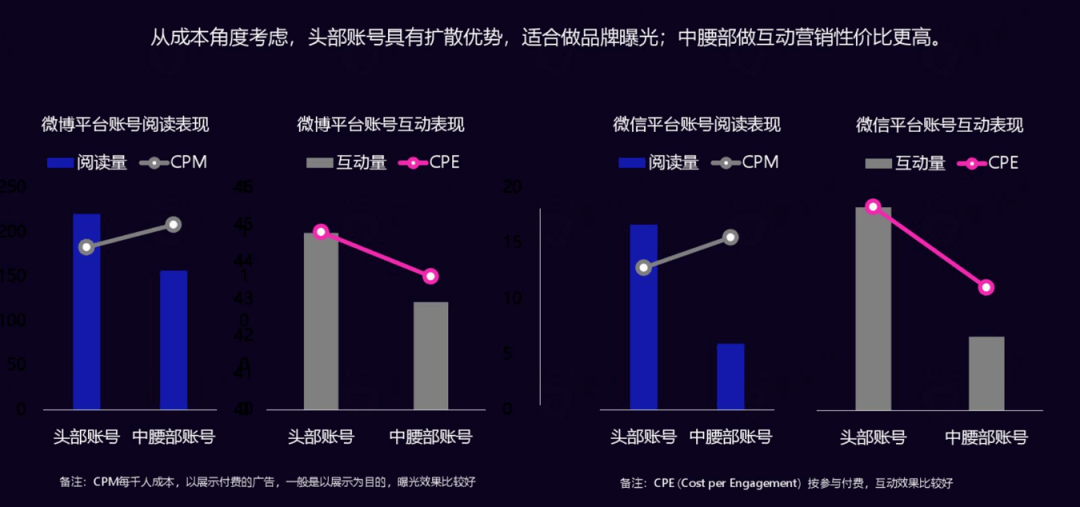 報告發現,投放中腰部帳號性價比更高。具體表現為,中腰部帳號的CPE(按參與付費)更低。投放中腰部KOL的ROI也整體表現更出色,且在穩步提升。簡而言之,頭部帳號的曝光數據(閱讀點擊數)表現更好,中腰部帳號的轉化數據表現更好。