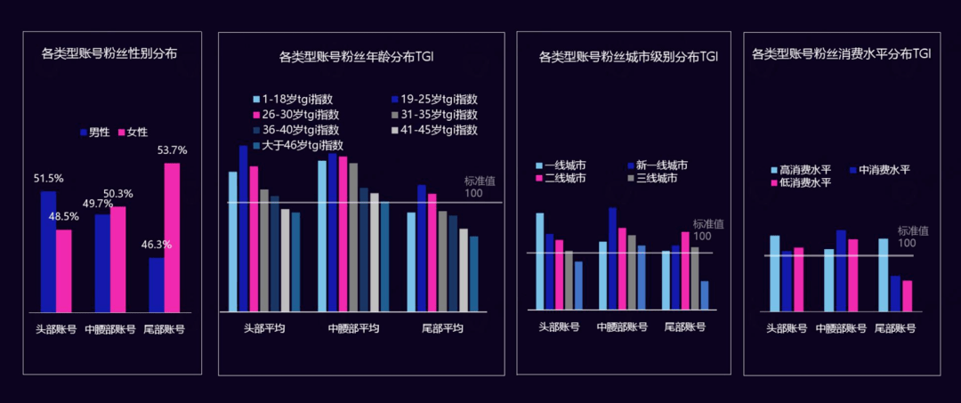 從上圖可以發現,平均來說,頭部帳號在40歲以上、三線以下城市、中低消費水平的人群覆蓋,相比中腰部帳號是有嚴重缺失的。