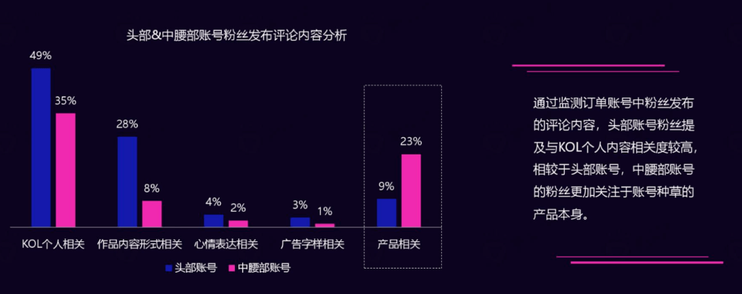報告顯示,對比投放頭部帳號和中腰部帳號的評論內容,頭部帳號關注產品的僅有9%,相比之下關注KOL本人的高達49%,傳播明顯模糊了焦點。