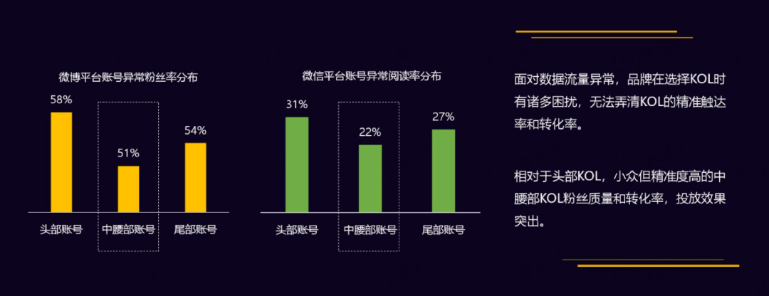報告直言不諱地指出,在微博平台,頭部帳號的異常粉絲率高達58%,就連尾部帳號異常粉絲都有54%,相比之下中腰部帳號異常粉絲率最低,但也有51%。聽起來很嚇人吧,但要按業內經驗,這數字可能還說低了……