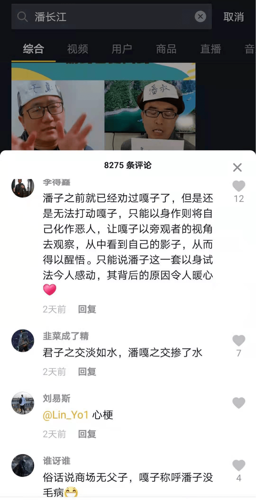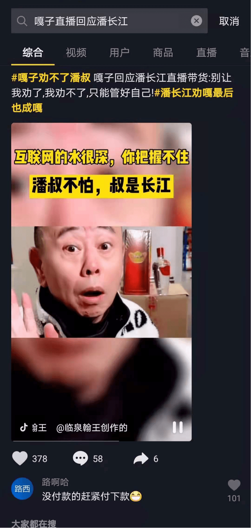 起因是小兵張嘎的主演謝孟偉做了一場直播帶貨,賣了假酒,被網友聲討,潘長江作為老藝術家在跟謝孟偉連線的時候,對謝孟偉進行了一番批評教育,「網上的東西都是虛擬的,你把握不住,孩子」、「別說你,就是那些大網紅們跟你的遭遇也是一樣的,因為這裡面的水很深」、「你缺錢嗎?你不缺,我不會pk,不會讓電商上」、「為了掙W,你有沒有……」