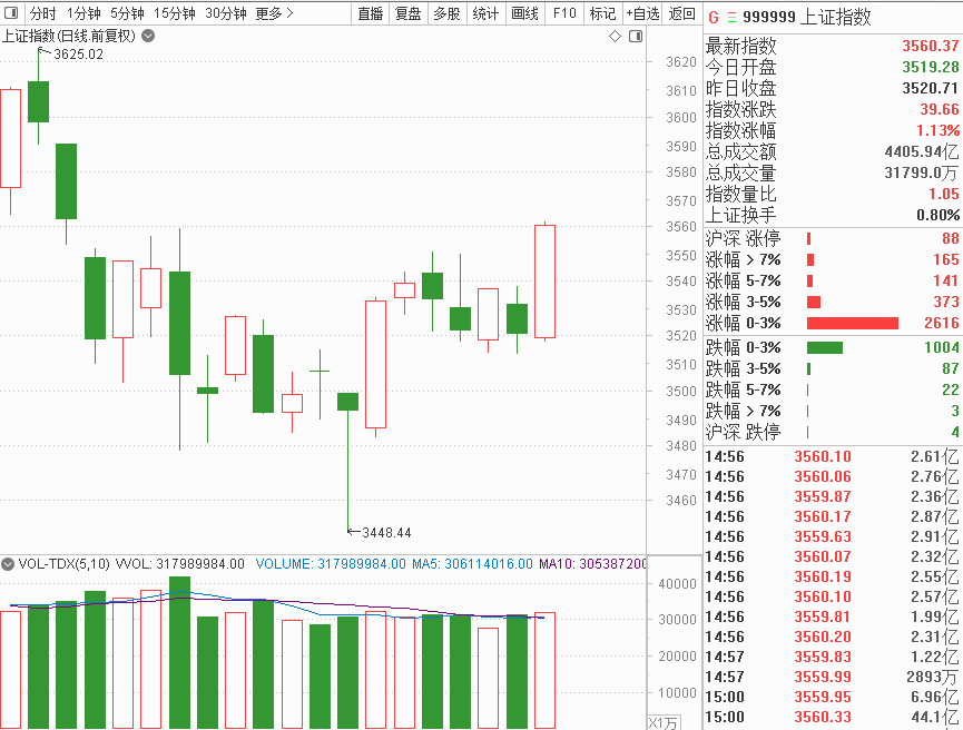 本周五,A股市場強勁反彈,滬指大漲近39.66點,漲幅1.13%,報收於3560.37點,兩市成交1.1萬億。