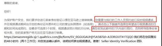 郵件表達,需要與賣家進行身份驗證,並且和工作人員預約進行實時視頻通話,視頻通話預計用時20分鍾左右,如果賣家沒有在收到郵件的7天內進行預約,帳戶將無法在亞馬遜上銷售!