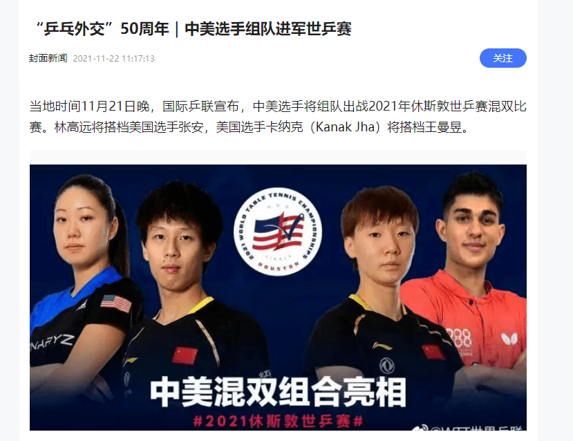 另外,國際乒聯宣布,中美選手將組隊出戰2021年休斯敦世乒賽混雙比賽。林高遠將搭檔美國選手張安,美國選手卡納克(Kanak Jha)將搭檔王曼昱。
