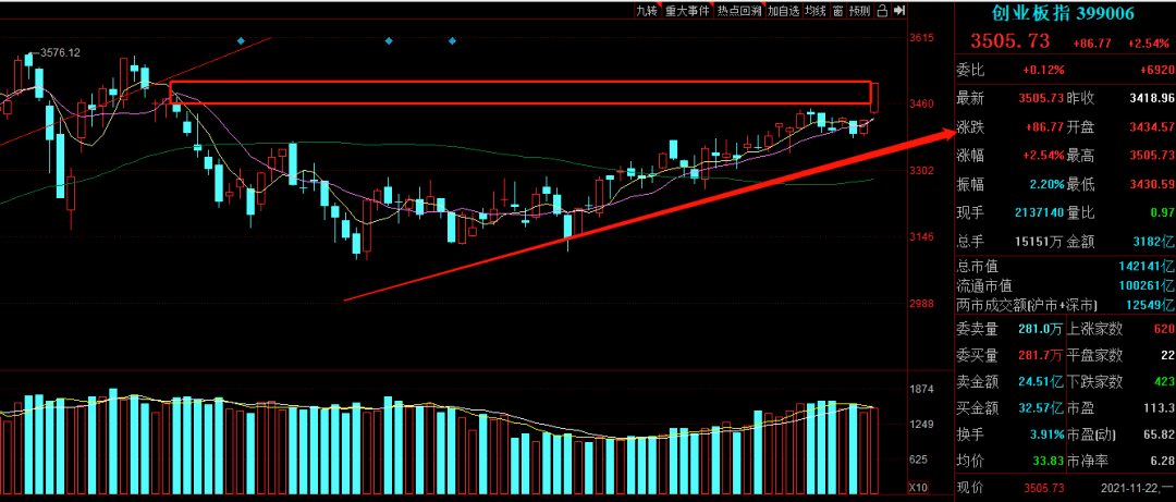 創業板高開高走,午後持續拉升重回3500點,鋰電池和半導體大幅走強,而光伏、醫藥、軍工相對較弱。