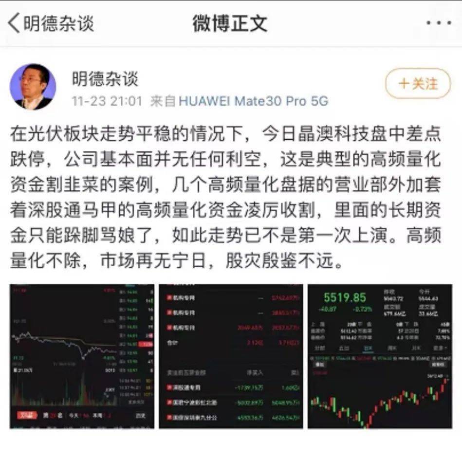 昨晚,南華基金副總經理在其微博「明德雜談」上表示:「晶澳科技盤中差點跌停,公司基本面並無任何利空,這是典型的高頻量化資金割韭菜的案例,幾個高頻量化盤踞的營業部外加套著深股通馬甲的高頻量化資金凌厲收割,裡面的長期資金只能跺腳罵娘了,如此走勢已不是第一次上演。高頻量化不除,市場再無寧日。」