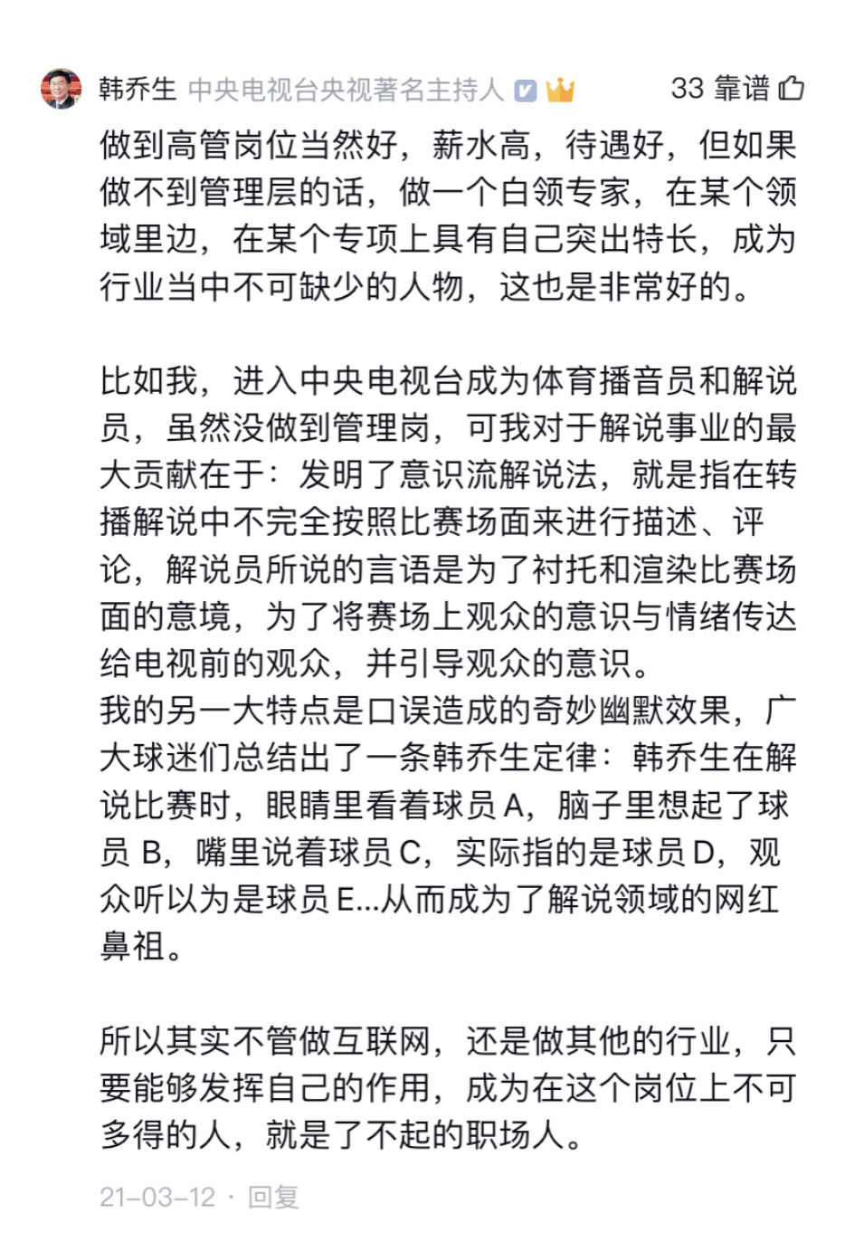 「大嘴」韓喬生也熱情地分享了自己的經歷,他進入中央台成為體育播音員和解說員,就沒能踏上管理崗位。但他獨創了「意識流解說法」,誤打誤撞成為了解說領域的網紅鼻祖,也算是開創了事業的新高峰。