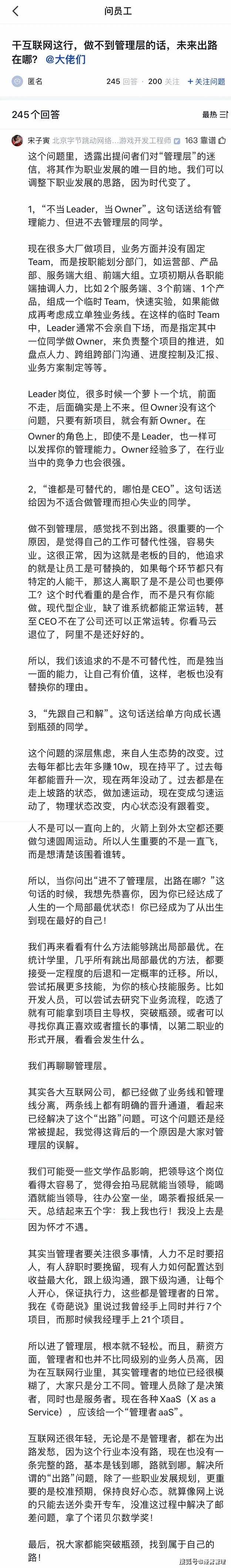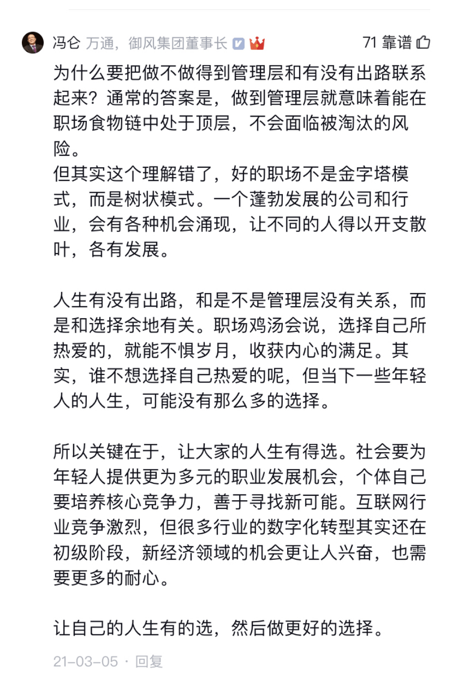 馮侖說,許多人把「做到管理層」和「出路」聯系在一起,反應了職場人的焦慮心情,我們往往認為,做到了管理層,自己就能在職場食物鏈中處於頂層,不會面臨被淘汰的風險。
