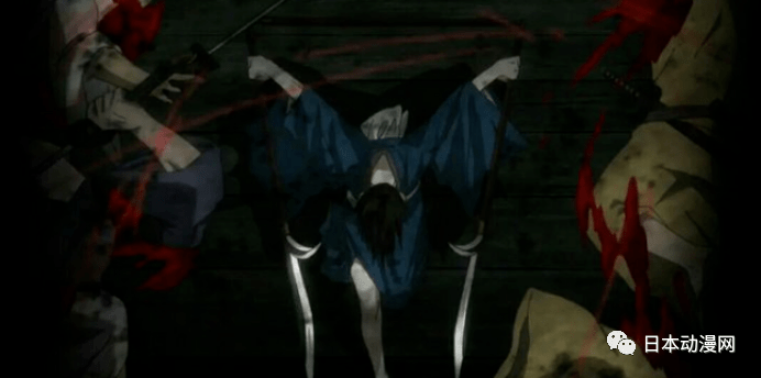 《無限之住人》中融入不少本土的傳說異聞,比如開頭男主角萬次不老不死是因為被八百比丘尼埋入「血仙蟲」的情節,便是《古今著聞集》記述中因人魚肉而活到八百歲的奇人八百比丘尼,這個角色性質在高橋留美子的《人魚之森》、手冢治蟲《火鳥》異形篇,以及游戲《死魂曲》中都有所體現。神秘的八百比丘尼也讓這個身處江戶時代的故事從工業時代之前的樸素置換上了一層奇幻色彩。但隨之劇情展開,萬次與仇敵的舉劍相向,女子纖細手臂脖頸噴涌而出的血液,逸刀流對凜父母的虐殺凌辱,獵奇與詭譎如畫面中流淌的血色慢慢滲透入每位觀眾心中。