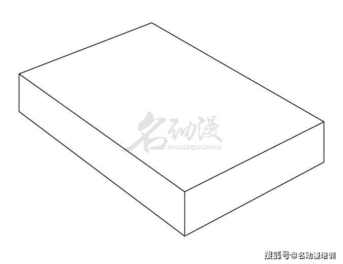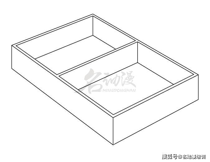 要點一:首先繪制一個立體透視的扁長方體出來,作為日式便當盒的外輪廓。在這種情況下,這個形狀可以採用兩點透視來繪制。如圖所示: