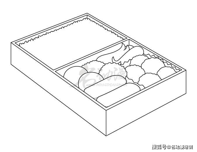 要點二:繪制好日式便當盒的外輪廓後,接著可以繪制裡面的隔層區域,一般是被分為兩個隔層(一邊大一般小),或者是三個隔層(一大兩小)。注意的是雖然大部分內部最終會被食物覆蓋,但最好用細線畫出這些,然後再擦掉。這樣可以避免錯誤,例如日式便當盒的不同部分沒有正確排列。如圖所示: