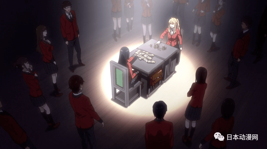 邀請女主進行賭博的是從男主身上贏走所有籌碼的女生,同時也是本班級中地位極高的人,為該作的女二。女主與女二在班級中展開賭博,賭博的類別與方式由女二決定,因為女二在這個班裡很有名,因此班裡的其他人都過來圍觀這場賭博,往人多的地方湊過去看熱鬧,這是大多數人最喜歡做的事情之一,同時也是一個看似十分平常的行為。