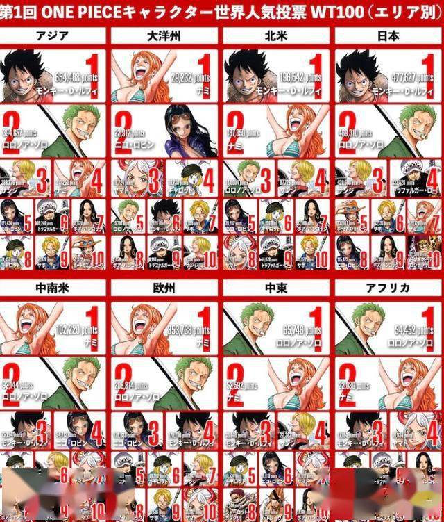 這次投票面向全世界,不同國家和地區的粉絲對於《海賊王》角色都有著各自的偏好,比如日本最喜歡路飛,而歐洲最喜歡的是 娜美,中東那邊則偏好 索隆——