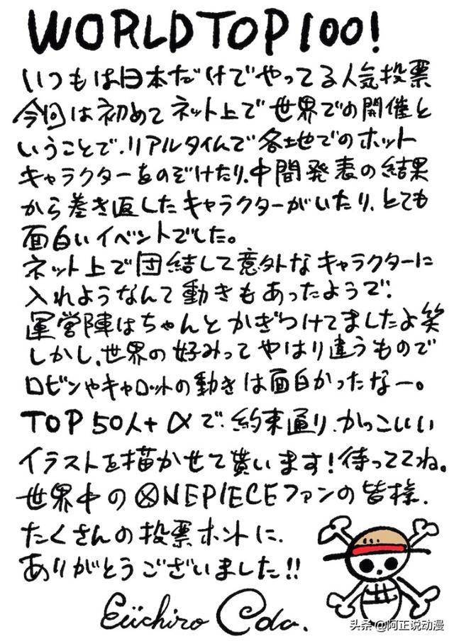 《海賊王》漫畫作者 尾田榮一郎也專門寫信祝賀評選結果出爐,並且表示將為前50名的角色專門繪制圖片,真是令人超級期待啊。