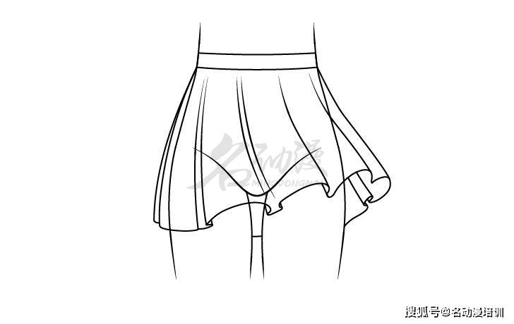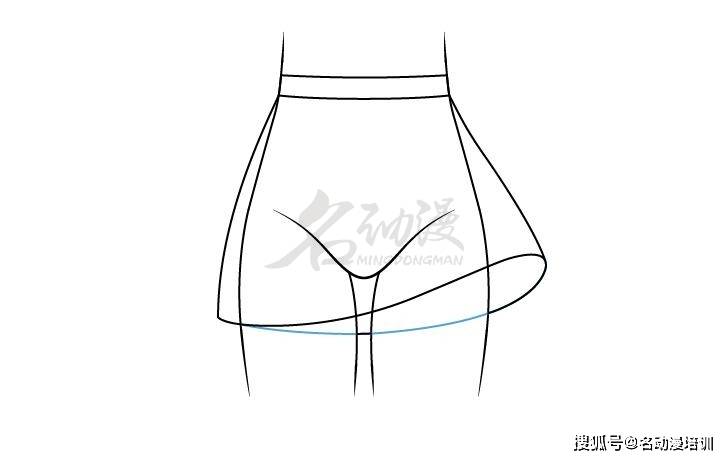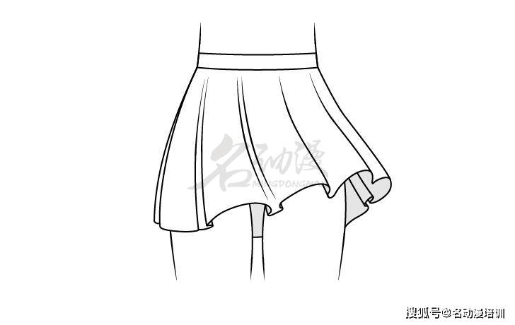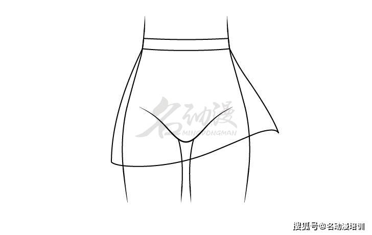 第二步:畫出裙子稍微傾斜到一個寬度,它的底部形狀像波浪。這部分將是裙子的「前景」部分。然後將皮帶區域添加到腰部。如圖所示: