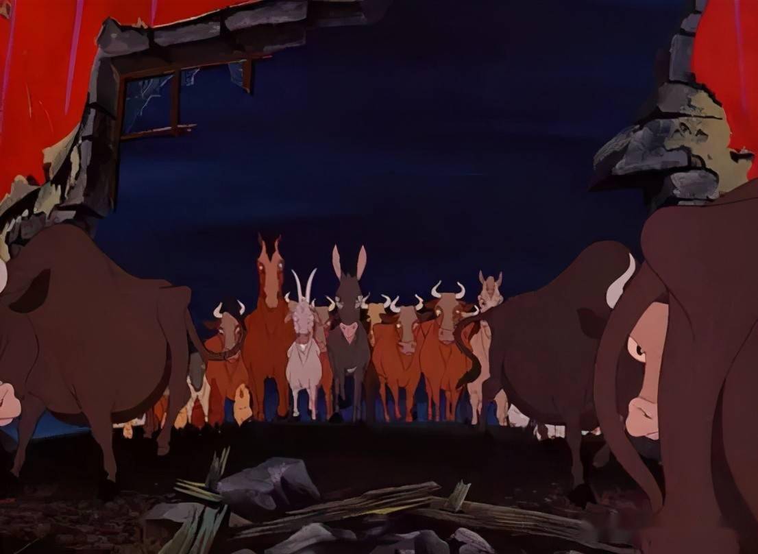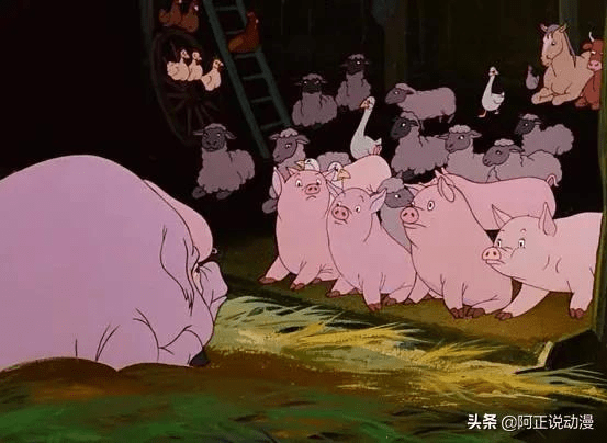 動畫《動物農場》保留了小說的大部分情節,以一個由豬統治的莊園為隱喻,對極權主義進行了無比辛辣的諷刺。