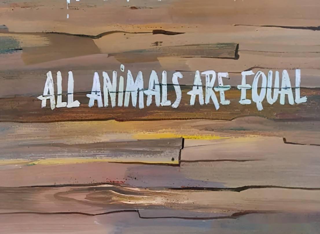動物們的生活每況愈下。終於有一天,牆上原來的所有戒令都不見了,代之以那句可笑更可怕的話: