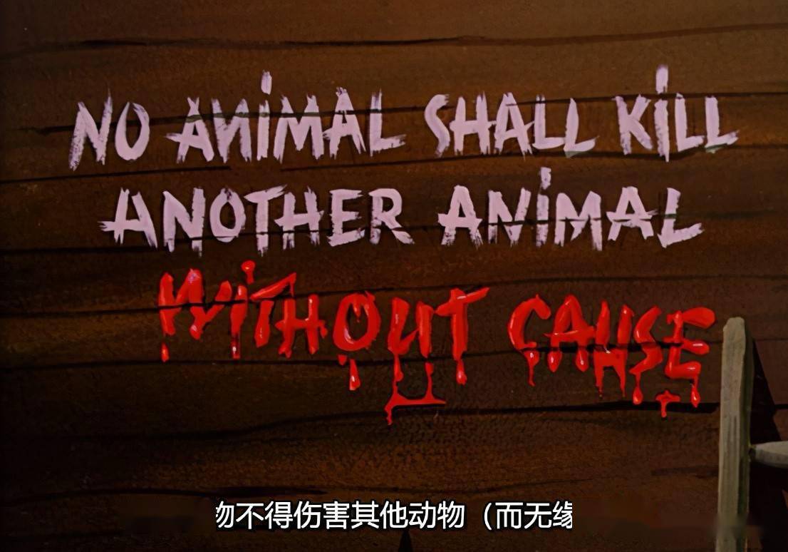 第二天,動物們發現牆上第三條戒令也改了,原來的「任何動物不得傷害其他動物」後面加上了「而無緣無故」幾個字。