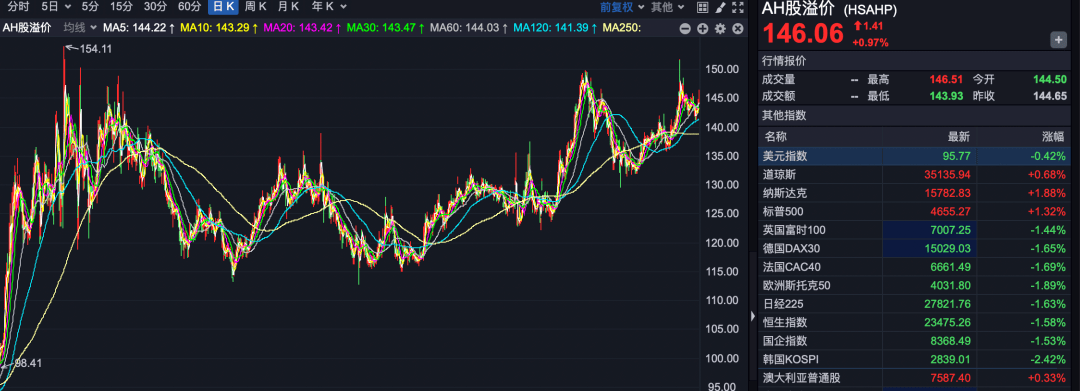 另外,關注港股的一個重要指標,AH溢價指數,近期隨著港股的回落,這個指數也在大漲。今天AH溢價指數上漲了近1%,達到146點。這個146點的意思,就是在A股和H股市場同時上市的公司,A股比H股大概平均價格溢價了46%。 近年來,A股和H股互聯互通之後,AH溢價指數大概在150點的時候,是一個重要的臨界值,一旦達到這個點位,可能就是港股的重要低點的出現,可以密切關注。