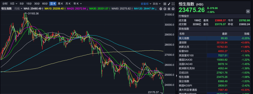今天,A股市場表現還算堅挺,滬指尾市翻紅,深成指和創業板指數也只是略微下跌。不過,港股市場卻遭遇重挫,恆指盤中一度大跌超過600點,創出今年新低23175.37點。盡管尾市有所回升,但依舊大跌366.60點,以23485.64點報收,跌幅1.54%。