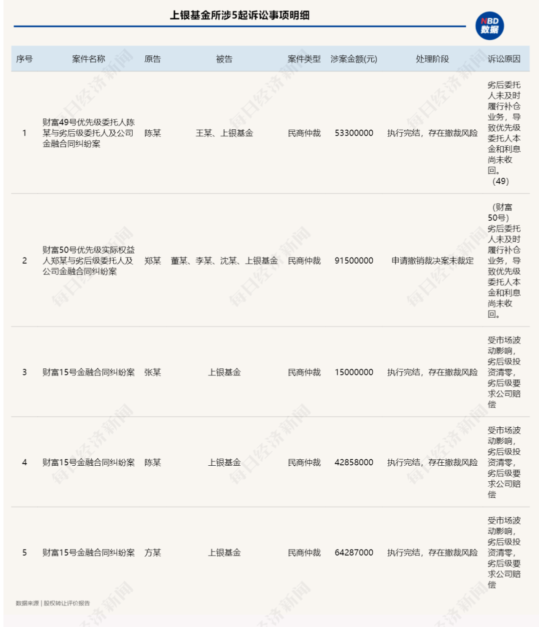 具體先從上銀基金來看,截止評估基準日,上銀基金共有5起訴訟事項,明細如下: