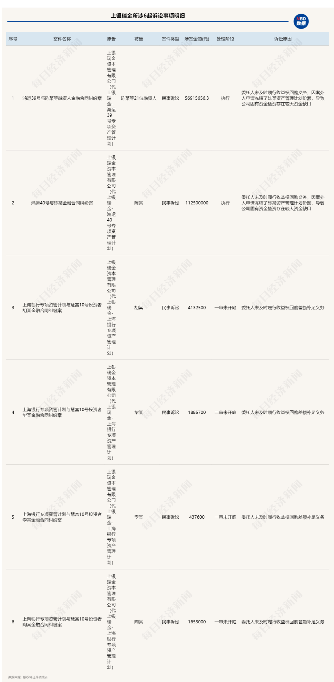 除了上銀基金本身的5起訴訟,子公司上銀瑞金也涉及了6起訴訟,具體如下: