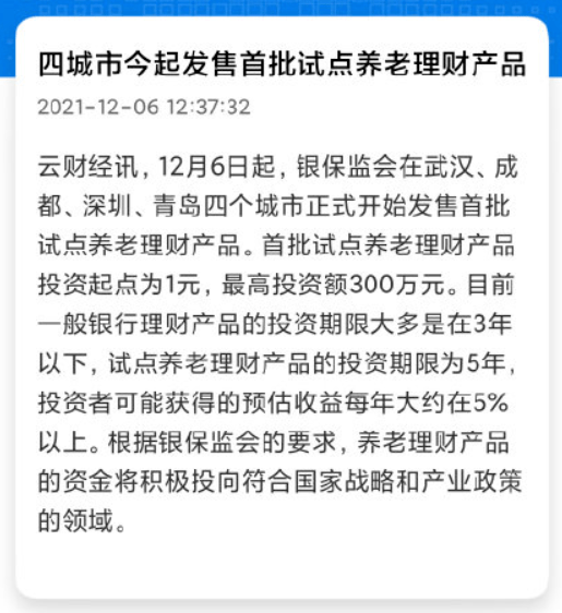 而首批養老理財產品試點只能在上述4個城市的4家銀行才能購買,預計後面會在其他城市陸續推開。