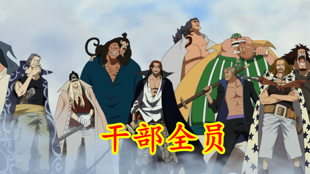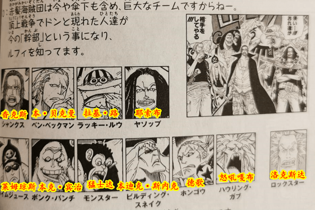 香克斯、本·貝克曼、拉基·路和耶索布這四人就不用多介紹了,扎著骷髏頭巾戴著眼鏡的是萊姆瓊斯,光頭無眉毛的是本克·賓治,猴子是猛士達,也是幹部,長發眼鏡有龍紋身的是本迪克·斯內克,束發左額有傷的是德歌,長得像獅子的是怒吼嘎布。