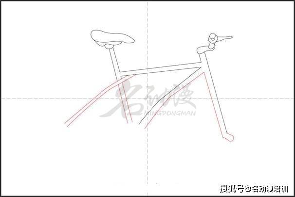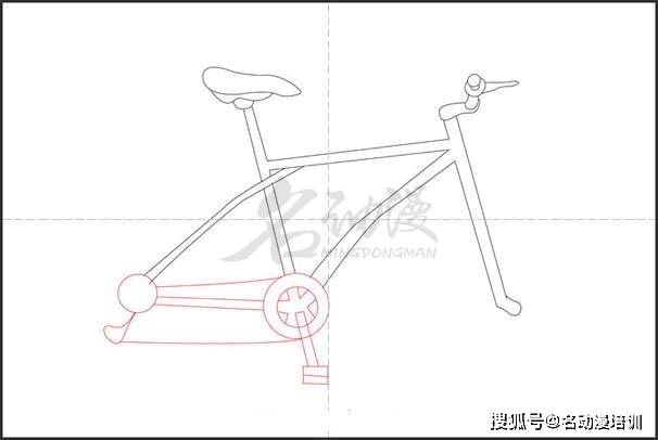 第二步:這一步我們要做的就是把單車的框架畫出來,接著橫杆與豎杆將連接車軲轆的幾個鐵桿畫出。