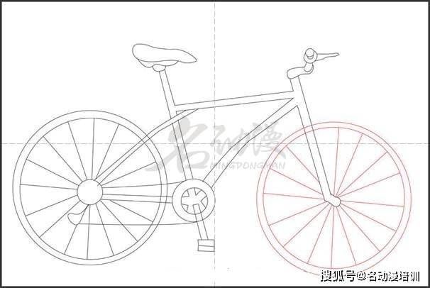第四步:將單車的前後輪一一畫上,然後在圓圈內畫上鋼絲,這樣單車的草稿就畫好了。