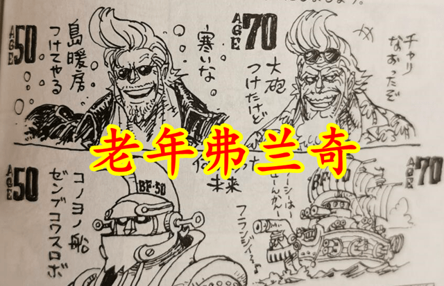 弗蘭奇作為半改造人,應該是會衰老的。如今弗蘭奇已經36歲,他年老的樣子,尾田在101卷的SBS中繪制了出來。自然還是兩個版本,正常的50歲:好冷,給島上安裝供暖設施吧;正常的70歲:自行車已經修好,但安裝了大炮。
