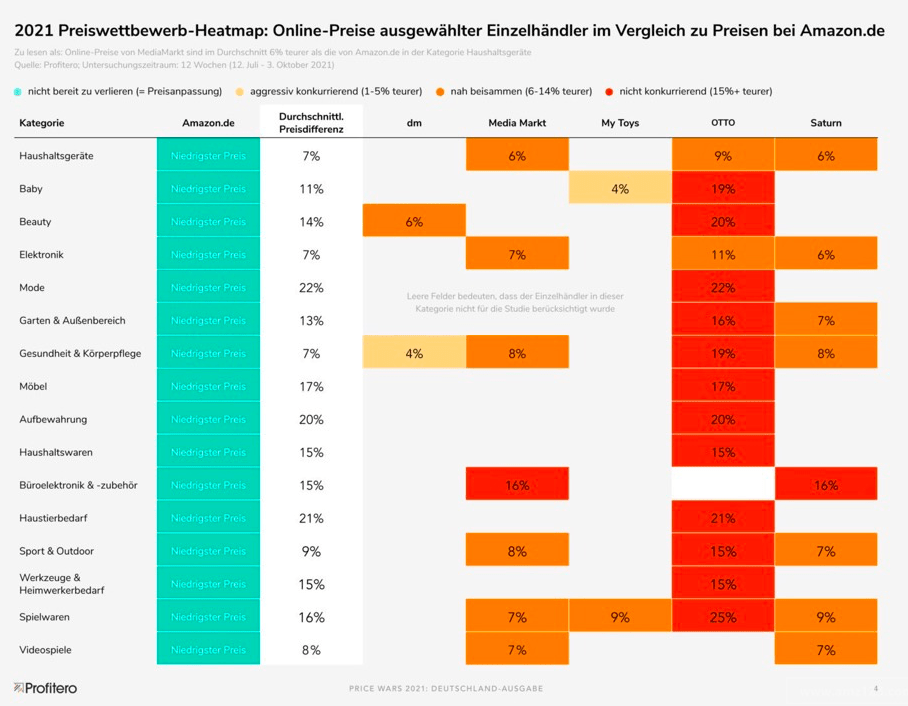不難發現,亞馬遜期初攻占德國市場的是低價策略。電子商務分析平台Profitero在德國首次比較了Amazon.de、dm、MediaMarkt、Mytoys、Otto和Saturn的16個品類的近15000件商品的在線價格。結果顯示,與其他五個競爭對手相比,亞馬遜的價格平均低14%。