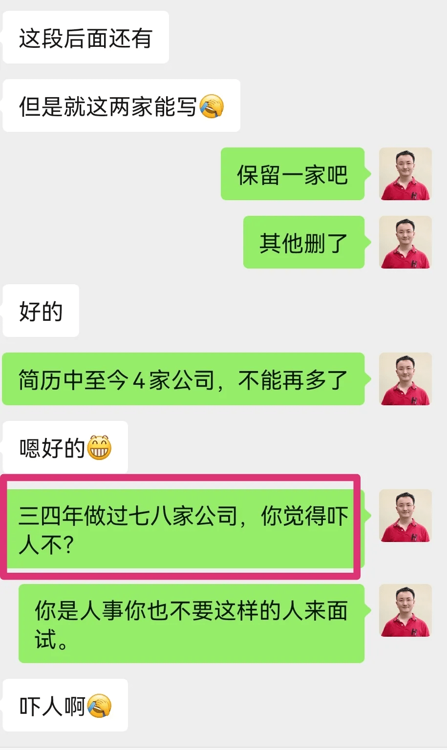 我們去一家公司,當然在意的是長久發展,至少也是相對穩定的,肯定不是期待一入職就想走或者被裁或者待不下去。跳槽戰術要符合整體職業戰略,別多了短期小幾個月的職業經歷,那是我們履歷中不好看的部分。實際上本文就是解決類似下圖這位群友的尷尬。
