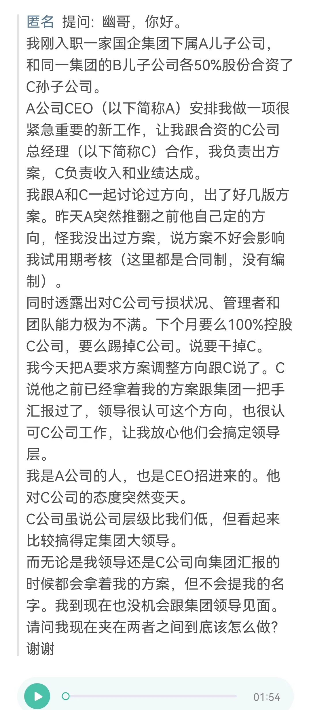 群友當下六神無主,根本不知道工作如何做,方法就是多說計劃、願景、遠景,但少做事甚至不做事,就一個字,「熬」,熬到A被C趕走,或者熬到A被換人即可,要麼你連合C將A搞走。