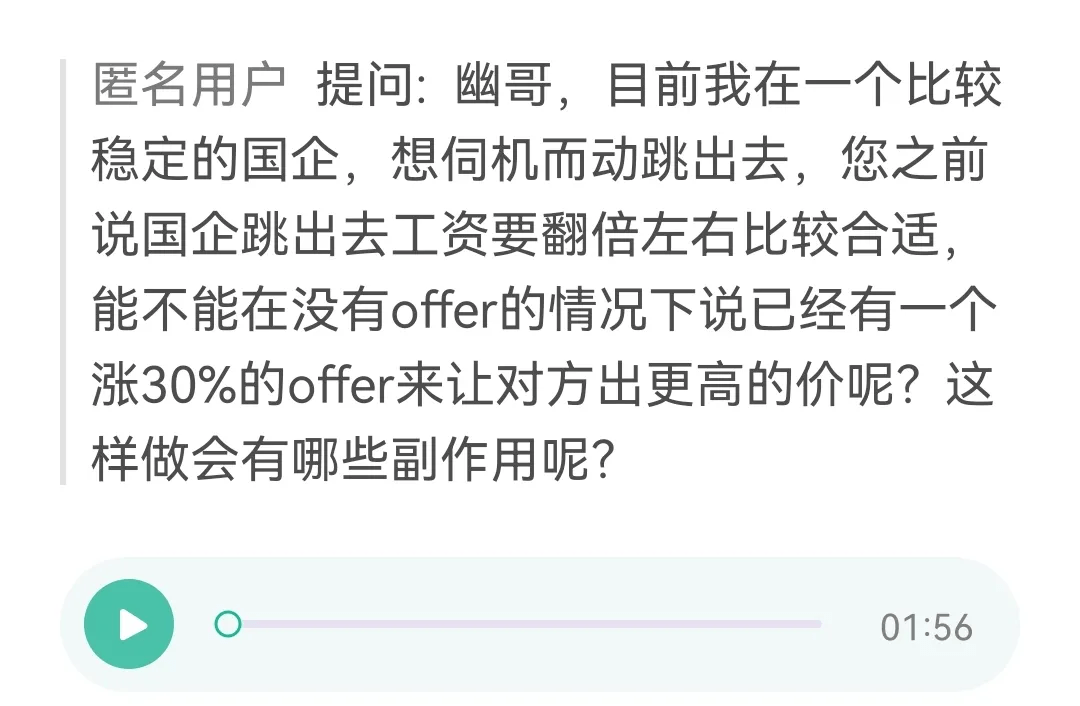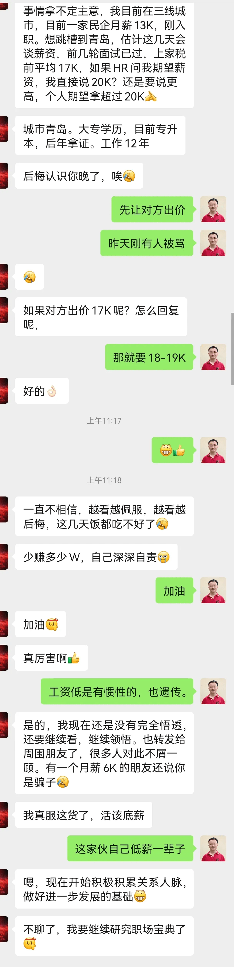 你看如下這位小城市的群友,他是我的類似忠實信徒了,在小城市大專畢業,過去十來年他跟他的同學一樣,都月薪五六千。遇到我後,我也沒指導,只是他自己看文章,偶爾星球問一兩個問題,你看下,跳槽1萬3再跳接近2萬,也不過半年時間可達成。