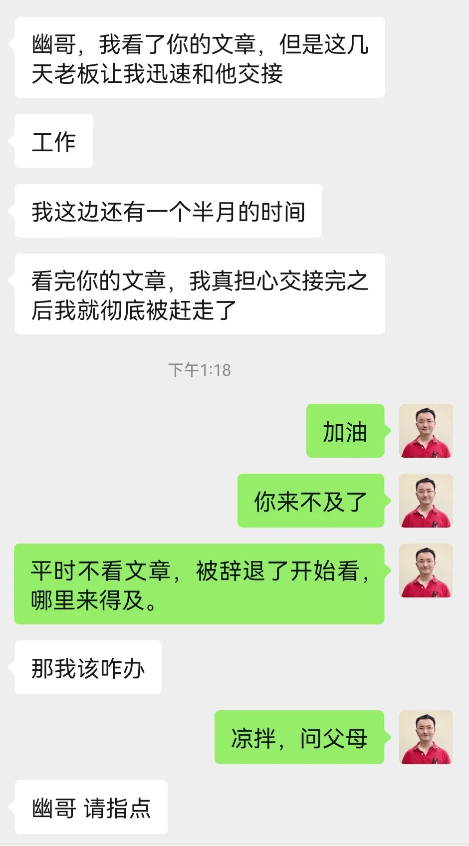這還算好的,算在職伺機而動,工資尚可,不急著換工作。就怕都進了群的讀者了,不看文章,每次問傻問題,都說自己看了。你看下一位群友,領導通知辭退她,她連應對辭退的流程都沒看,答應領導後迅速被交接了工作,開始慌了。