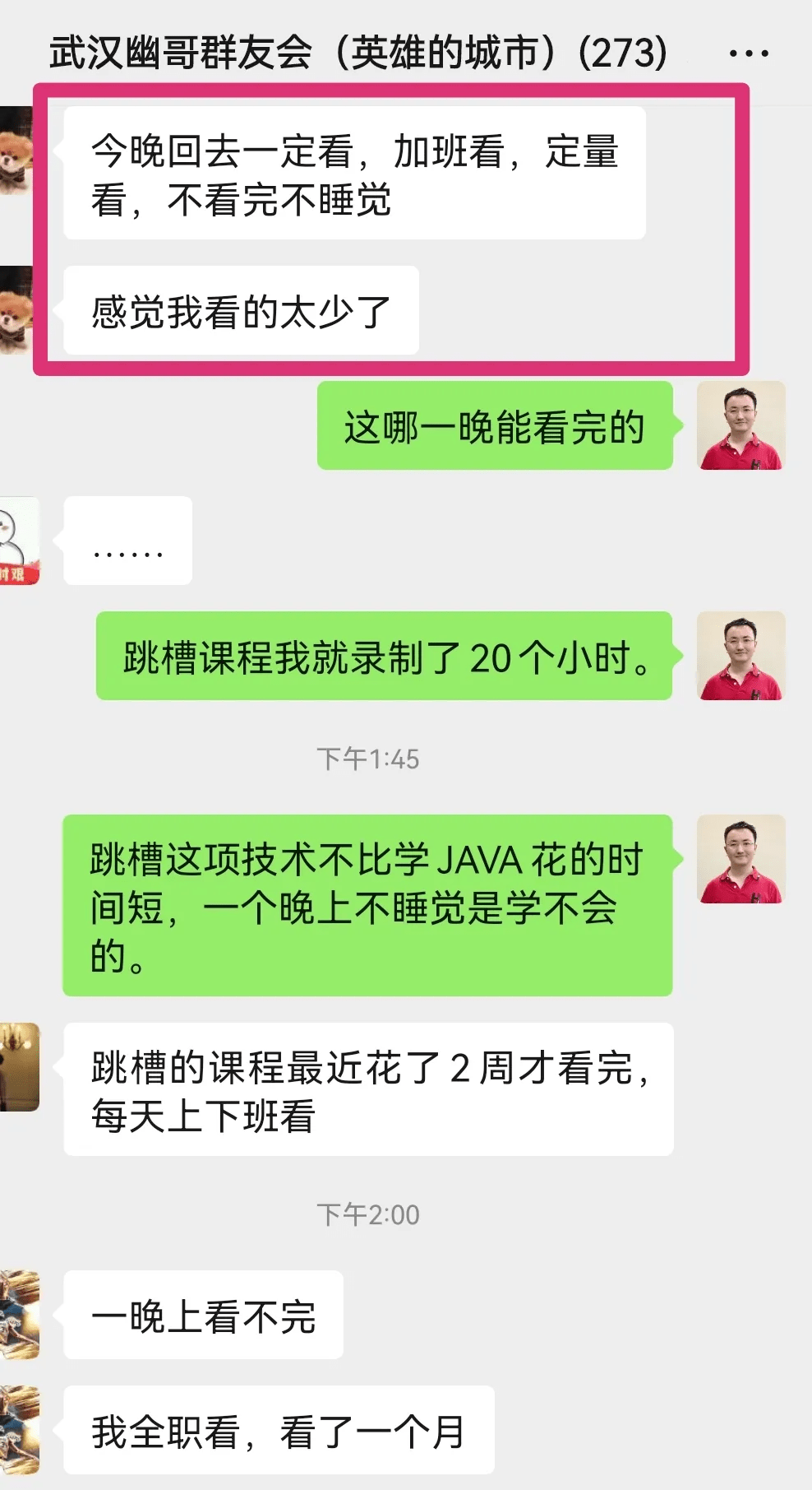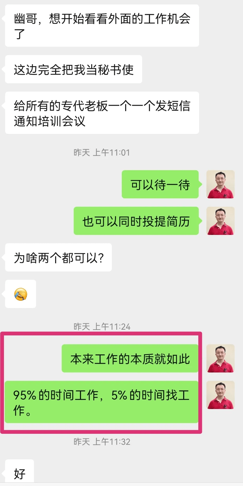 以上,大家記著,學習跳槽技巧,大致需要1年或者2次用我的方法跳槽,才大致能學得會。且大家不要轉發我的文章和視頻、語音等給你的親友,他們難以認知和學得進去,還說你要害他,甚至我們有女群友她老公說我是傳銷組織的頭子。