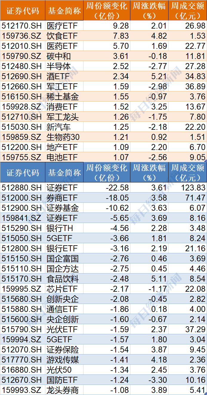 在行業主題ETF方面,本周份額增長超過1億份的有14隻基金,其中醫療ETF、飲食ETF和醫藥ETF份額分別增加了9.28億份、7.83億份和5.7億份,分別淨流入資金7.57億元、9.14億元和3.99億元,份額均再創歷史新高。