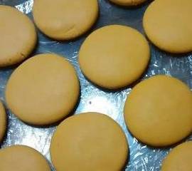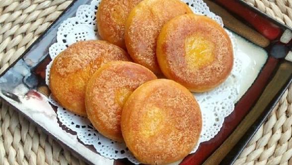 8,做好的南瓜餅胚平底鍋放少許油,小火煎熟,裝盤。要小火,不然很容易糊鍋。廚友@王CC說,要熱油下鍋,小火。不然容易沾。