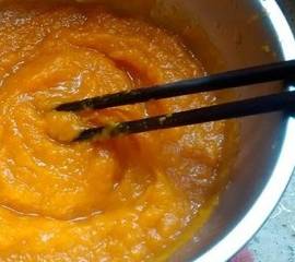 4,攪拌均勻的南瓜糊放涼到不燙手的程度。不要南瓜糊燙的要死就把糯米粉加進去。
