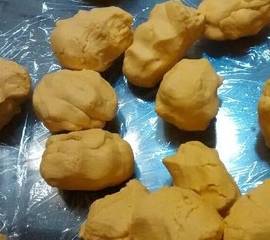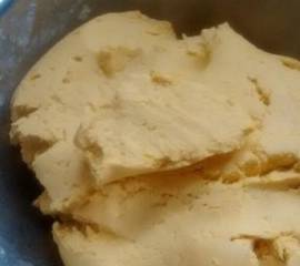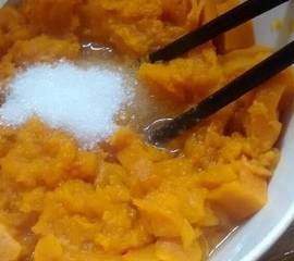 3,熟南瓜泥還有520克,趁熱加入白糖攪拌融化。南瓜要是甜就少加糖,不甜就多加糖。愛吃甜的就多加糖,不愛吃甜的就少加糖,南瓜特別甜的,不加糖也可以啊!